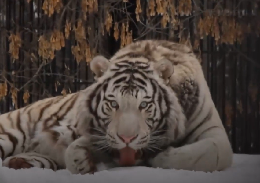 Группа «ЗооГородок54» во ВКонтакте опубликовала видео, на котором белый тигр по кличке Кови гуляет после завтрака в Новосибирском зоопарке имени Р. А. Шило.