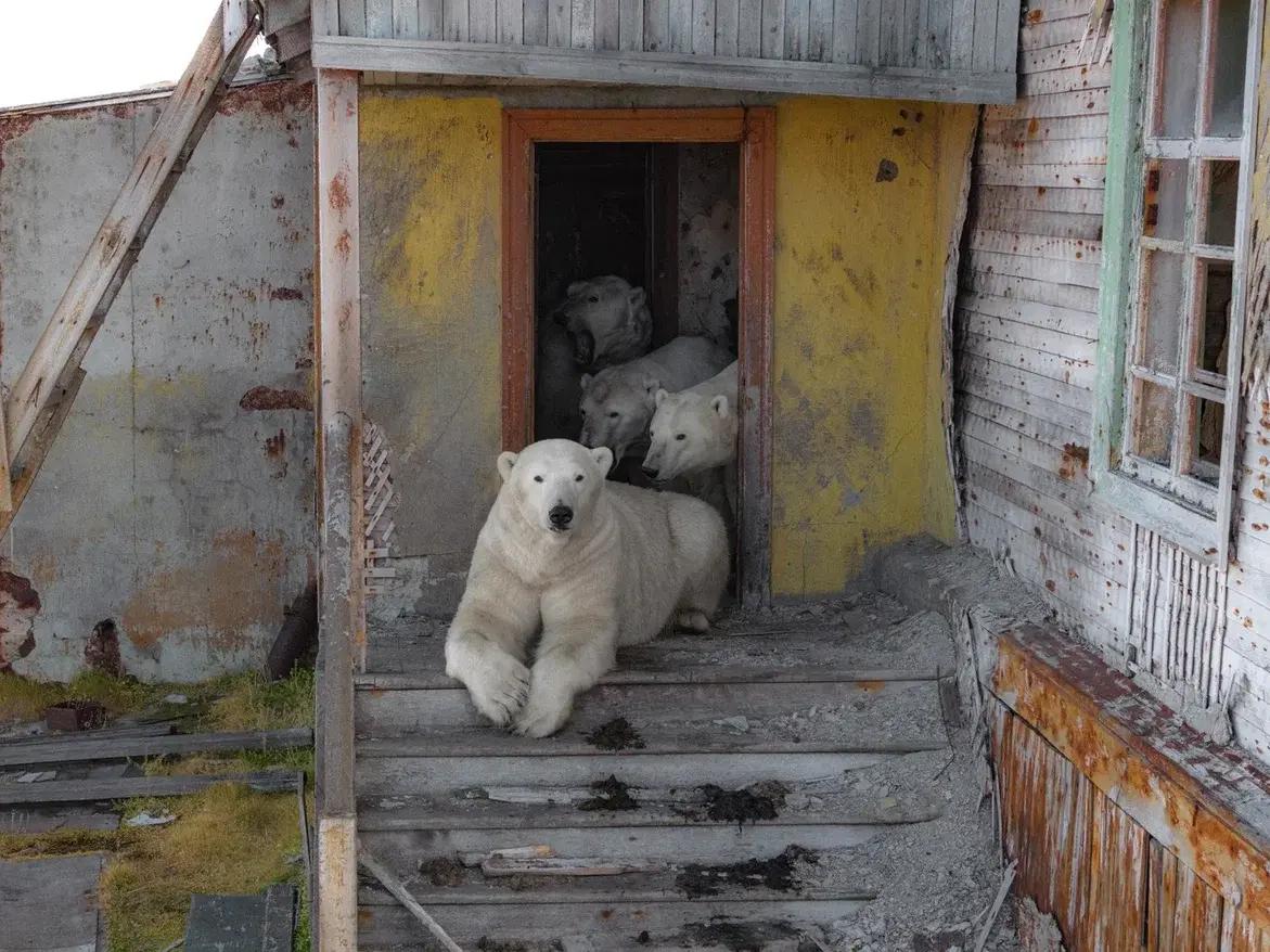 На этом небольшом острове обитает крупная популяция белых медведей. Животные используют покинутые дома в качестве укрытий.