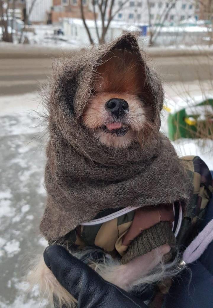 А этот пушистый друг решил выйти на прогулку, утеплившись стильной косынкой.