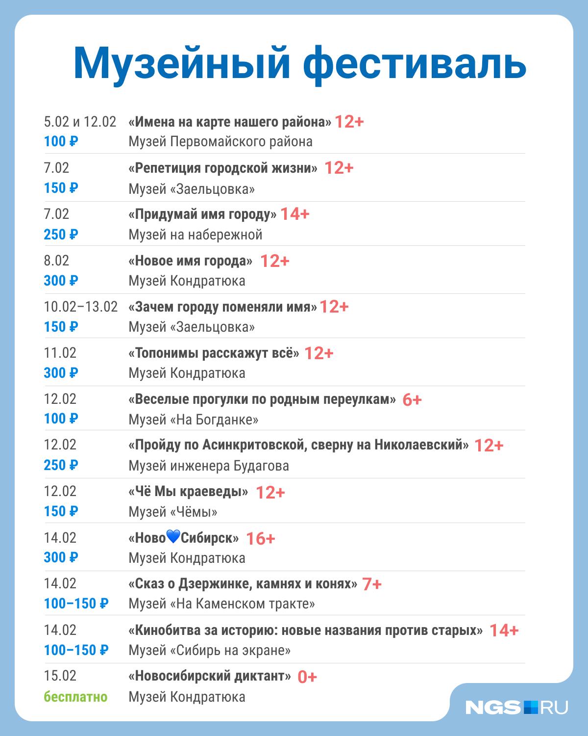 Завершится фестиваль 15 февраля в 16:00 бесплатным диктантом о Новосибирске (0+) в музее космонавтики имени Кондратюка. Для регистрации требуется позвонить по номеру +7 913 735-03-37.
