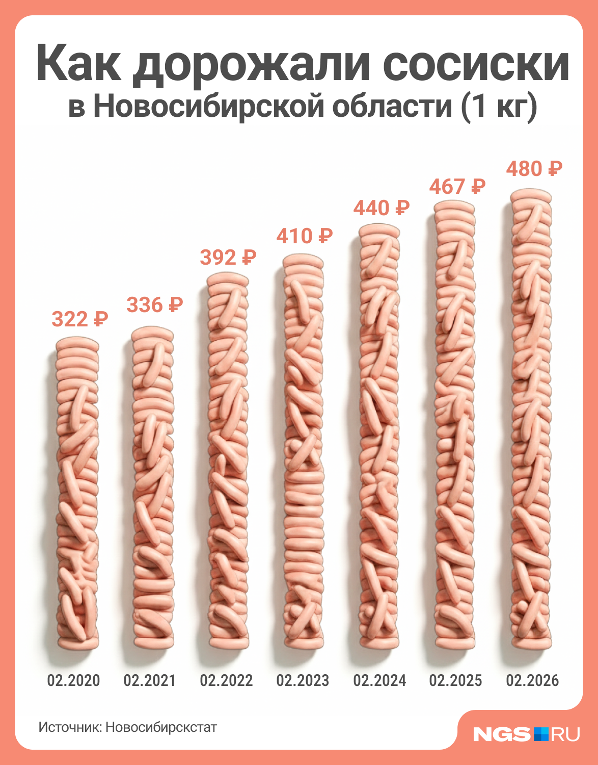 По данным Новосибирскстата, за последние шесть лет средняя цена на сосиски и сардельки в регионе выросла на 33%.