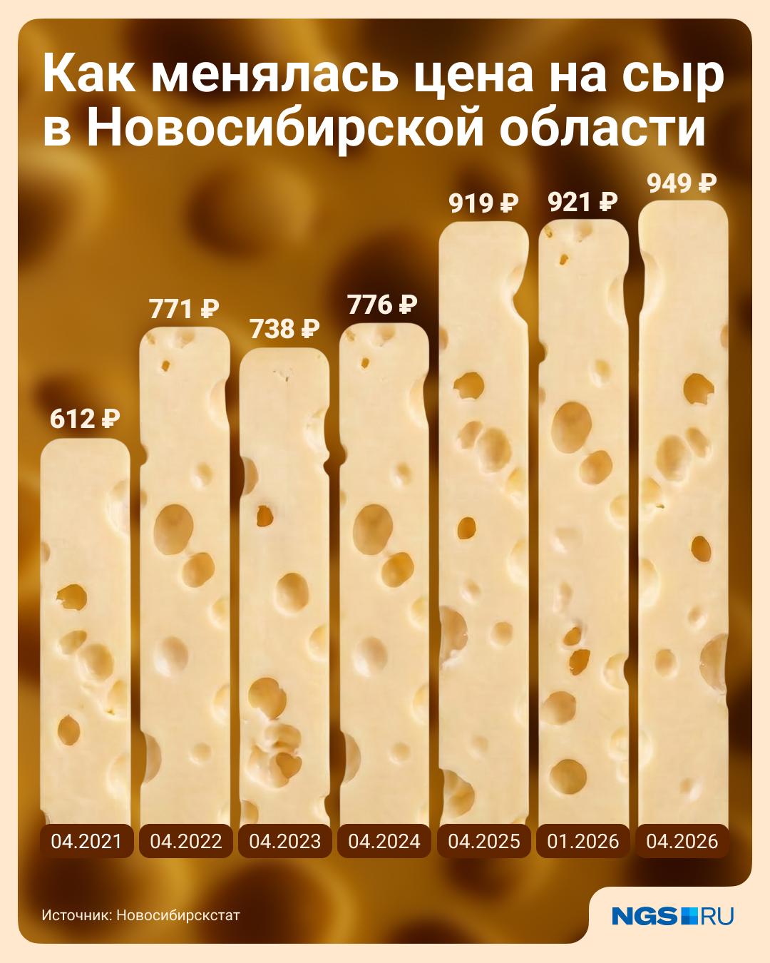 В Новосибирской области продолжает расти стоимость сыра. Согласно статистическим данным, с января 2026 года цена увеличилась на 3%: если в начале года килограмм продукта стоил 921 рубль, то к 16 апреля средняя стоимость достигла 949 рублей.