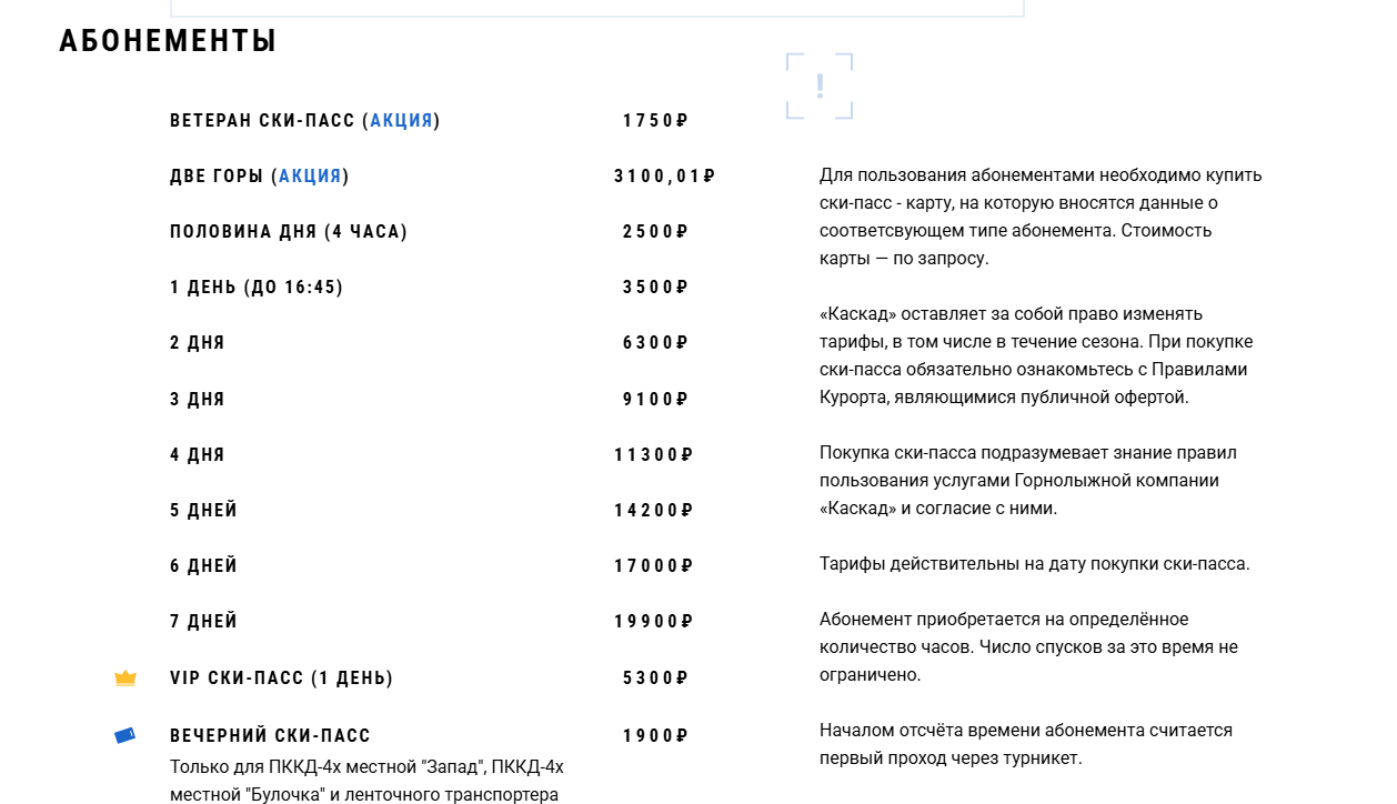 Согласно обновленным данным на сайте группы «Каскад», стоимость абонементов изменилась следующим образом: