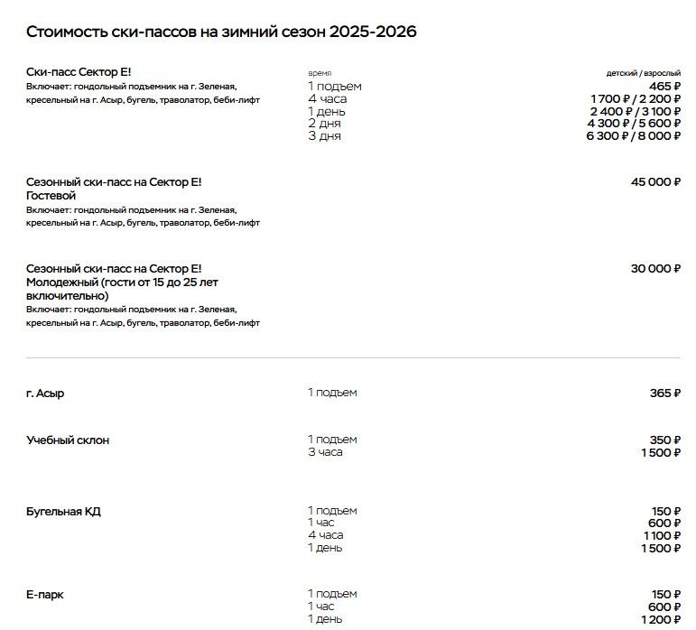 В секторе Е абонементы не подорожали, но разовые подъемы стали стоить дороже во второй раз