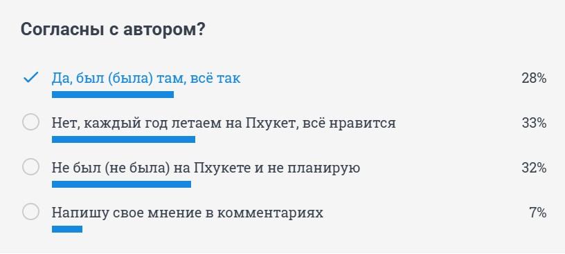 Другие читатели выразили недовольство. Иван-Т отметил: «Во многом не согласен с автором. Но то, что тайцы зажрались и откровенно доят туристов своими „законами“, — это 100%. Посетили Пхукет после долгого перерыва. Ничего не изменилось, стало только хуже. Спасибо, в ЮВА много других нормальных мест». Анонимный комментатор провёл параллель с родным городом: «Тай такой же разный, как и наш город. На Красном проспекте вроде всё ок. Поезжайте на Хилокскую, и всё будет наоборот». Ещё один пользователь посоветовал альтернативу: «Пхукет, да и Фукуок вьетнамский в этот сезон по количеству туристов что наш Сочи. Инфраструктура островов просто не справляется, да и тайцы не особо спешат реагировать на такой наплыв туристов. А опытные туристы в этот сезон отдыхают в Паттайе и на островах близ Паттайи. Вот где рай и чистота, и дешевле процентов на 30, и народу мало. К слову, Паттайя 10 лет назад и сейчас — это два разных города. А вообще мой непрошенный совет — не нужно спешить за толпой! Вам туда, возможно, не надо». Читатель Cheer просто констатировал: «А у меня и раз там побывать нет желания. Не понимаю, что там вообще делать». Анонимная путешественница, много раз бывавшая на острове, дала рекомендации: «Я была на Пхукете не меньше 10 раз. Согласна, что надо избегать мест, удаленных от отелей и крупных туристических локаций. Также избегать маленьких грязных кафешек, особенно на пляже. Рестораны должны быть стационарными, большими. Надо просто внимательно смотреть, куда заходишь. Мы, к слову, ни разу животом не мучились, так как следовали определенным правилам».