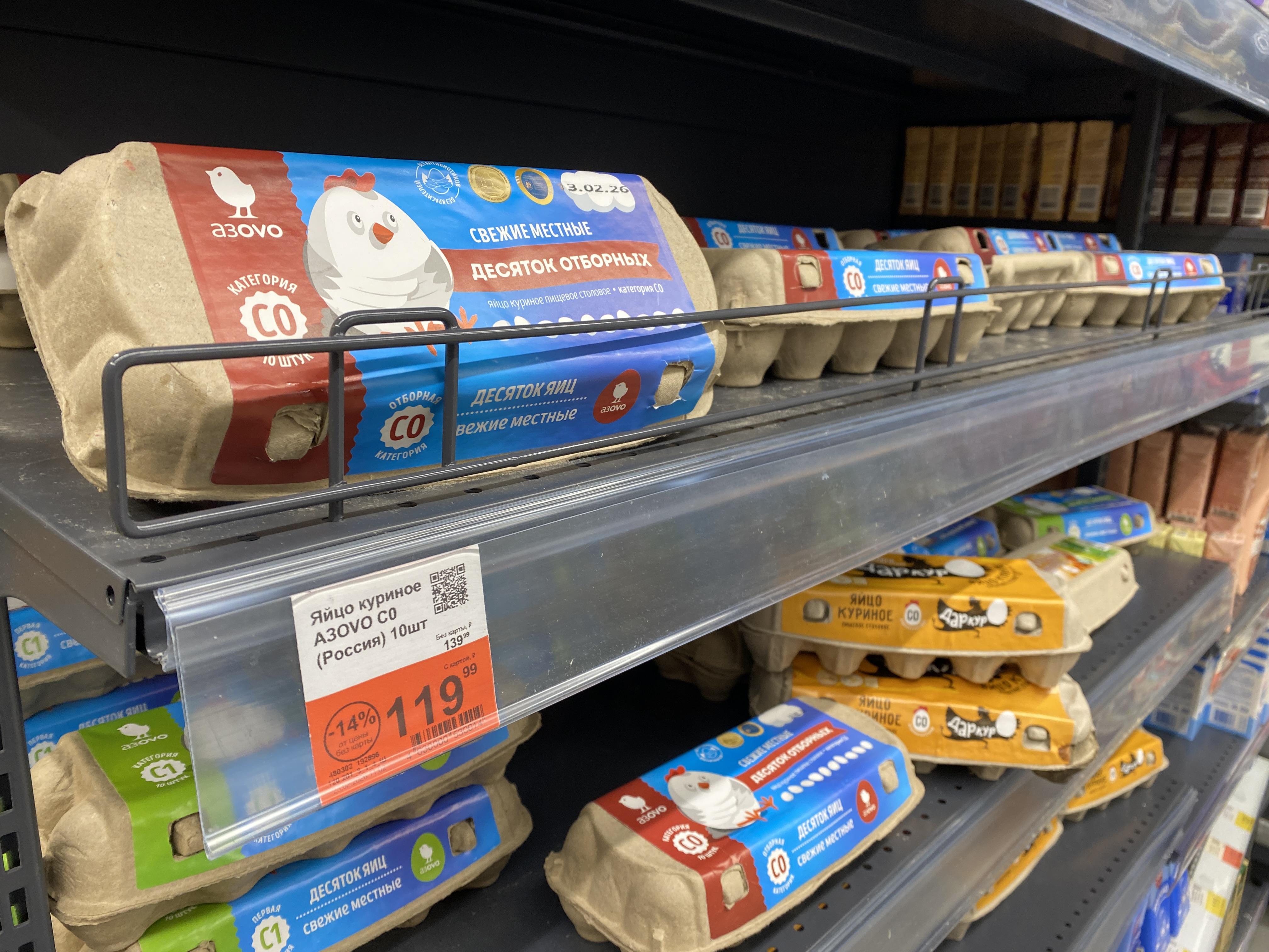 В «Пятёрочке» нижний порог цен немного выше. Яйца С2 под собственным брендом обойдутся в 68 рублей, С1 — в 69 рублей. Верхняя ценовая планка — 130 рублей за десяток С0 бренда «Дар кур». Указанные цены округлены, фактически они на одну копейку ниже.