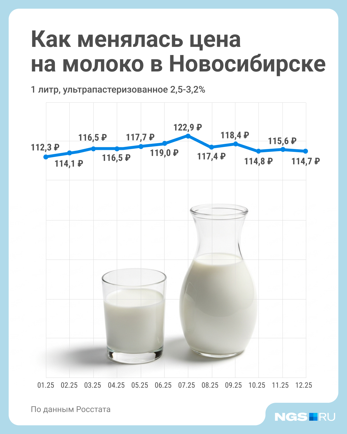 Стоимость литра молока в Новосибирске за 2025 год увеличилась на два рубля. Согласно данным Росстата, ультрапастеризованное молоко жирностью 2,5–3,2% в январе в среднем стоило 112,26 рубля, а к декабрю цена достигла 114,73 рубля.