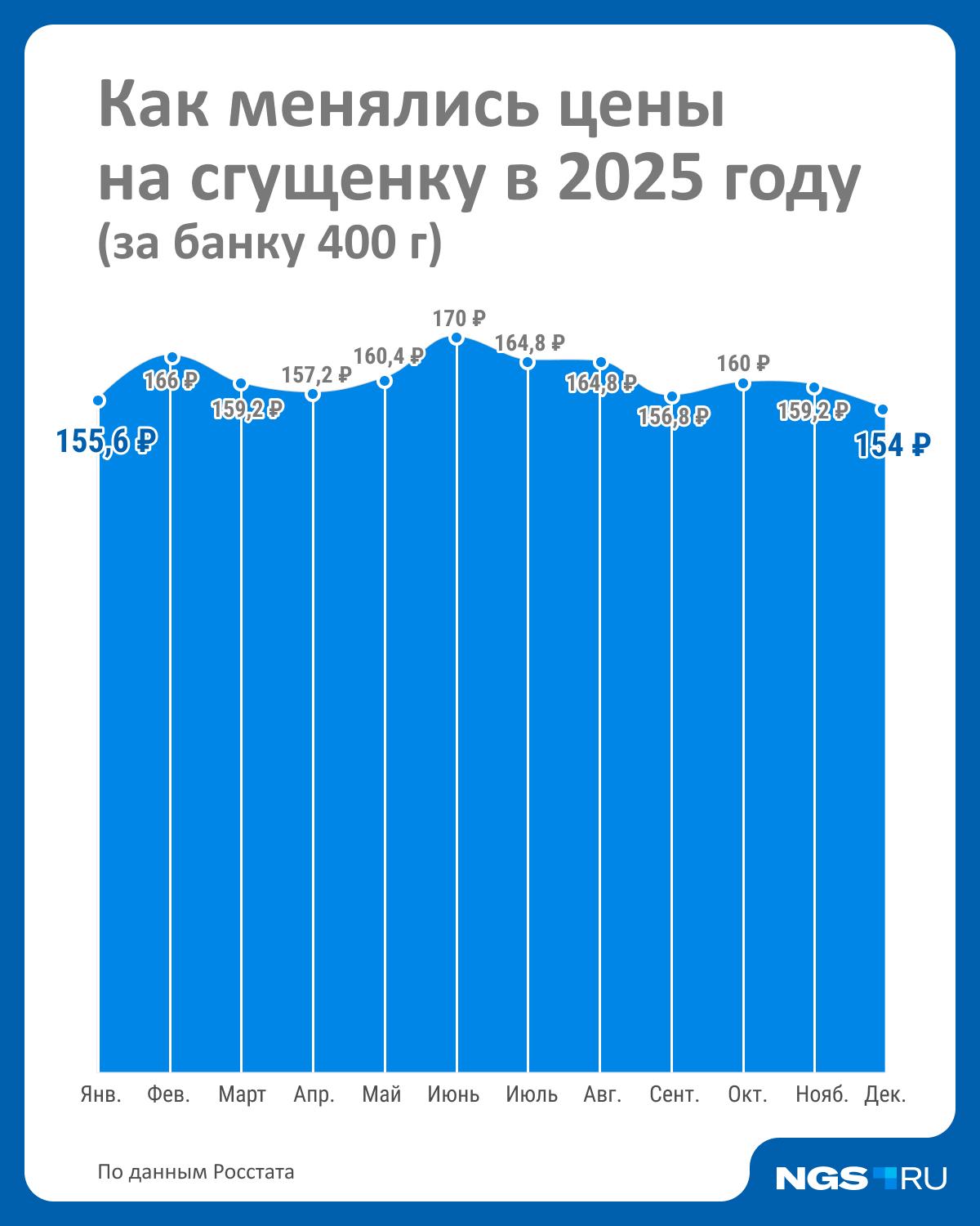 Согласно данным Росстата, стоимость сгущенного молока в Новосибирске за 2025 год снизилась на 4 рубля за килограмм. Изменения цены в течение года отражены в инфографике.