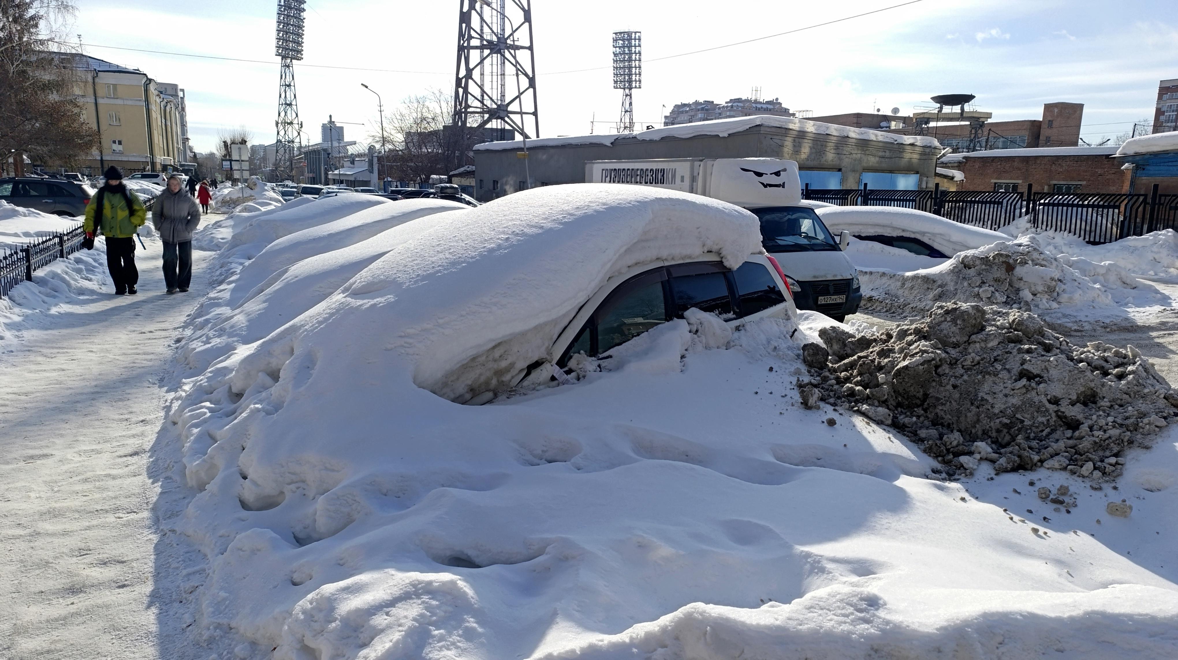 Снег заполнил не только стоящие машины, но и свободные участки парковочных карманов.
