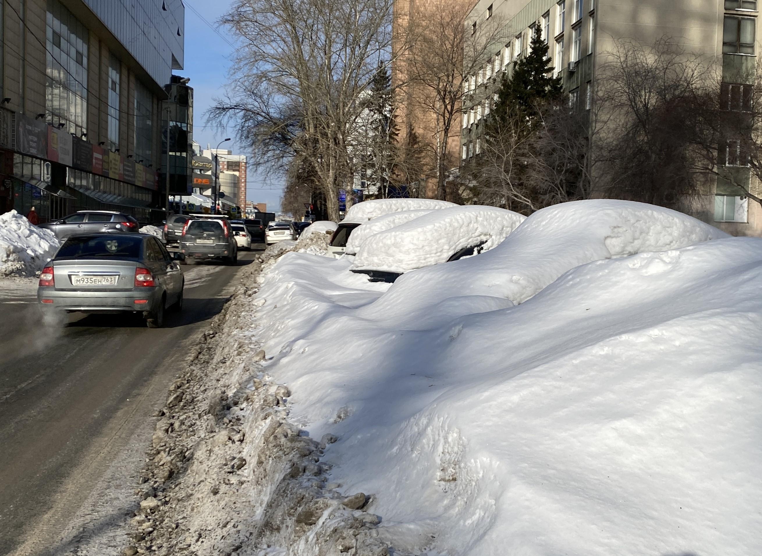 По обеим сторонам улицы стоит примерно два десятка машин. В ряде случаев без специальных средств невозможно определить, является ли снежный холм сугробом или автомобилем.