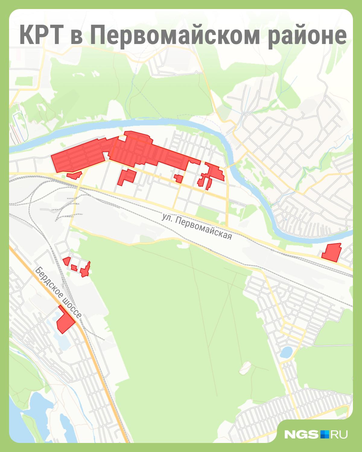 Изображение карты с обозначением участков под комплексное развитие в Первомайском районе.