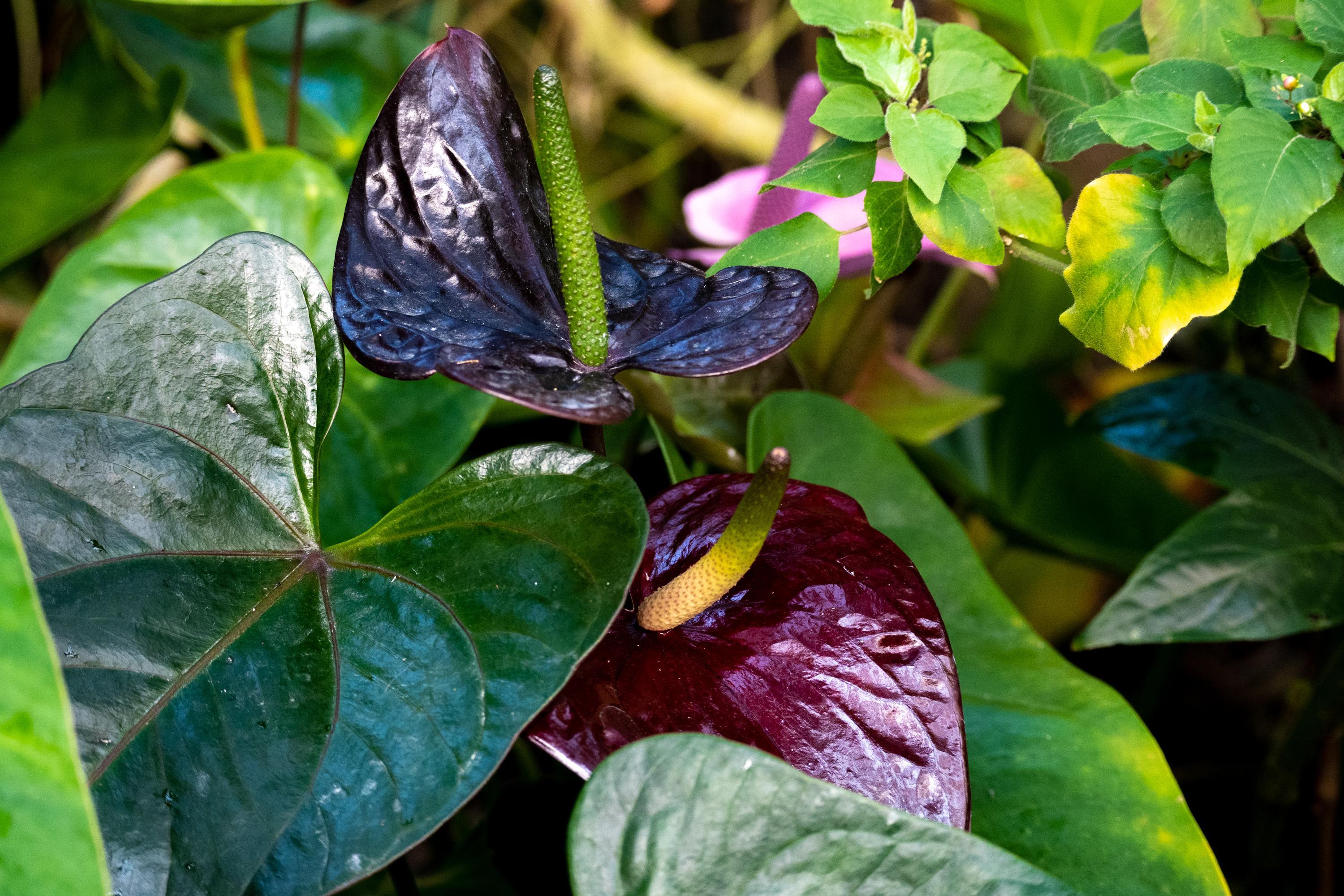Цветы антуриума «Блэк Лав» отличаются глубоким бордовым оттенком, который в зависимости от освещения кажется почти черным.