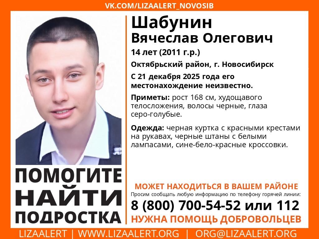 Поисковый отряд «ЛизаАлерт» сообщил об исчезновении 14-летнего Вячеслава Шабунина в Новосибирске.