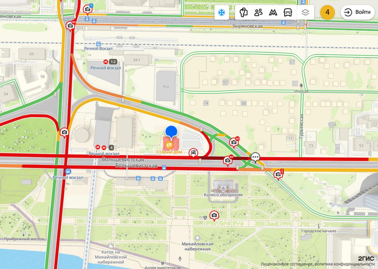 В приложении 2ГИС этот отрезок дороги окрашен в красный цвет.