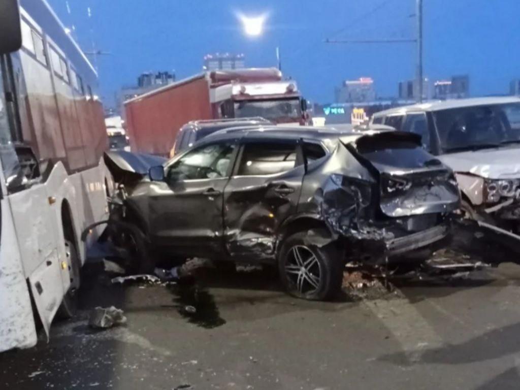 На Октябрьском мосту произошло массовое дорожно-транспортное происшествие с участием шести легковых автомобилей и автобуса «НЕФАЗ».