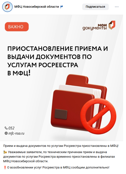 В официальной группе МФЦ во «ВКонтакте» опубликовали сообщение: «Уважаемые заявители, по техническим причинам прием и выдача документов по услугам Росреестра временно приостановлены в филиалах МФЦ Новосибирской области».