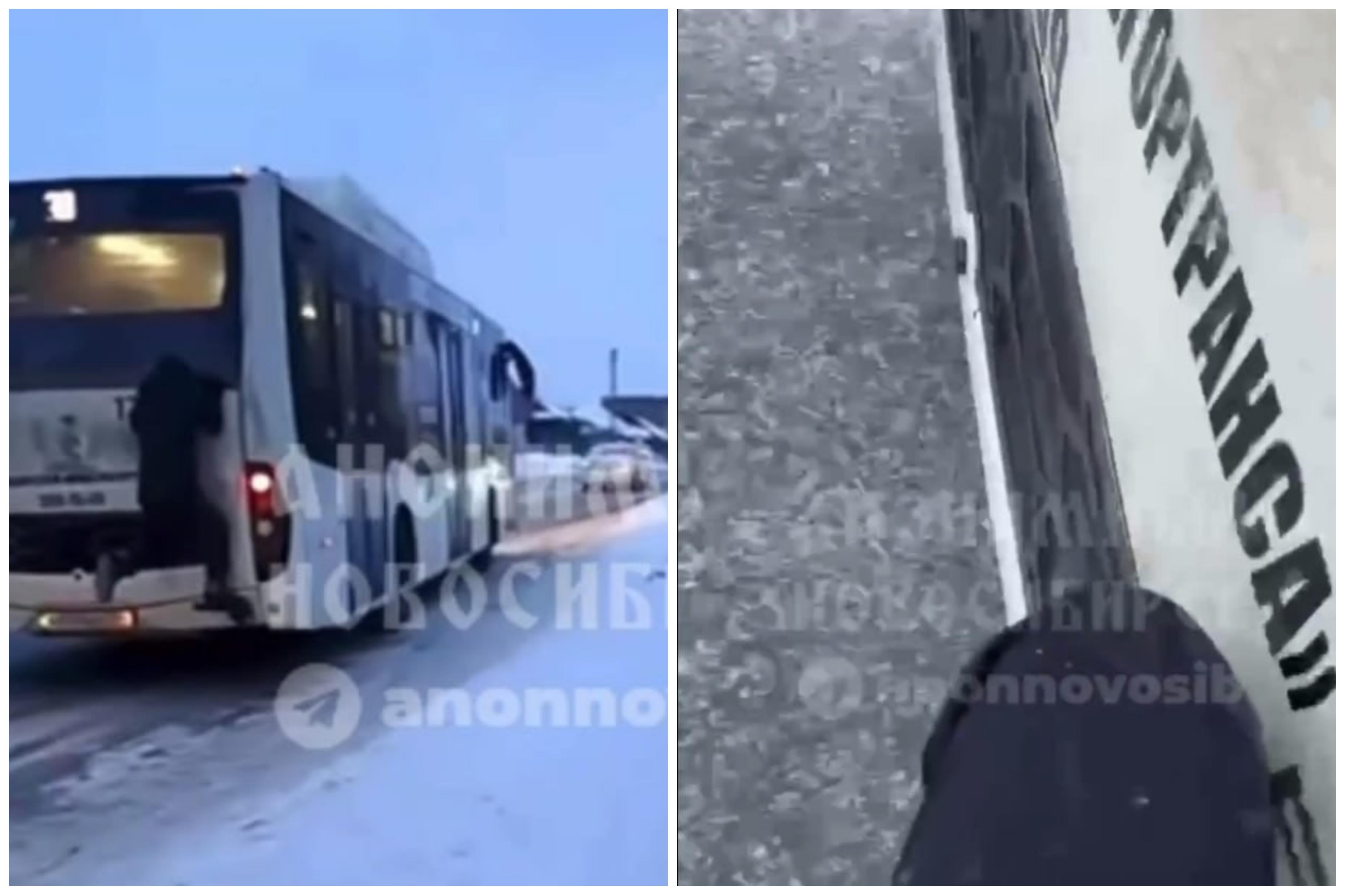 На кадрах видно, как молодой человек цепляется за задний бампер автобуса и проезжает так некоторое расстояние.