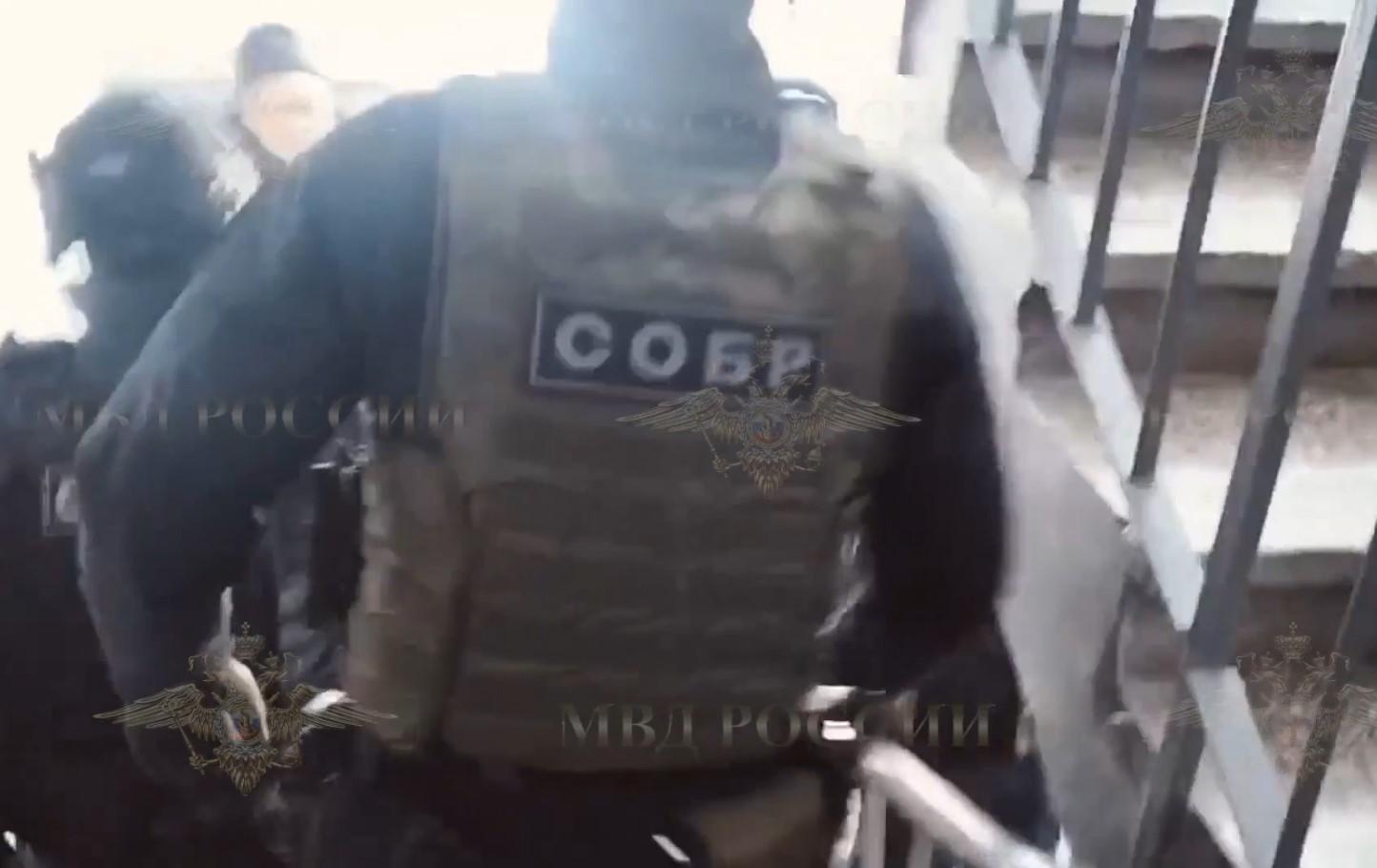 На кадрах видно, что мужчина стоит лицом к стене, а затем его ведут по лестнице сотрудники СОБРа и полиции.