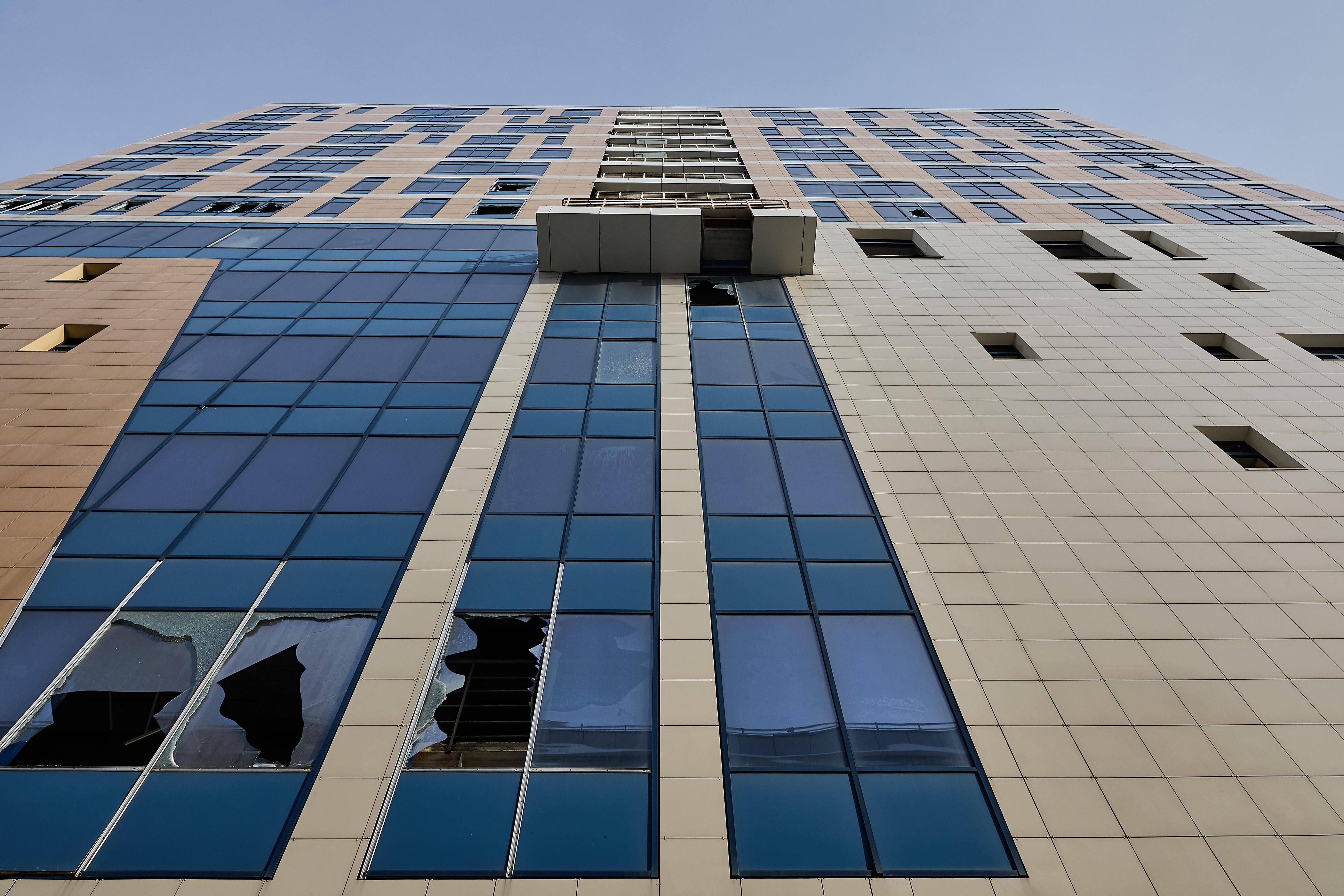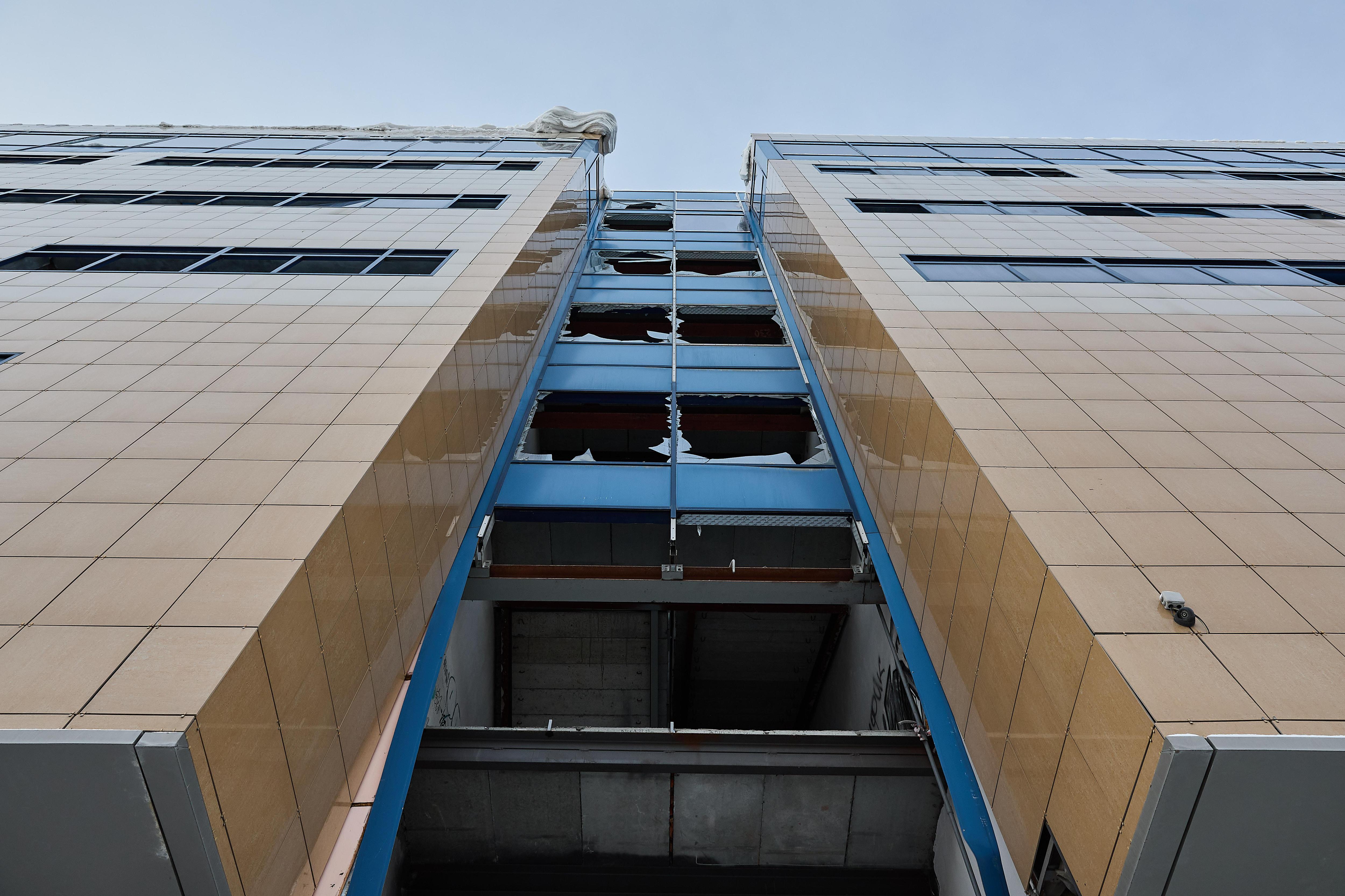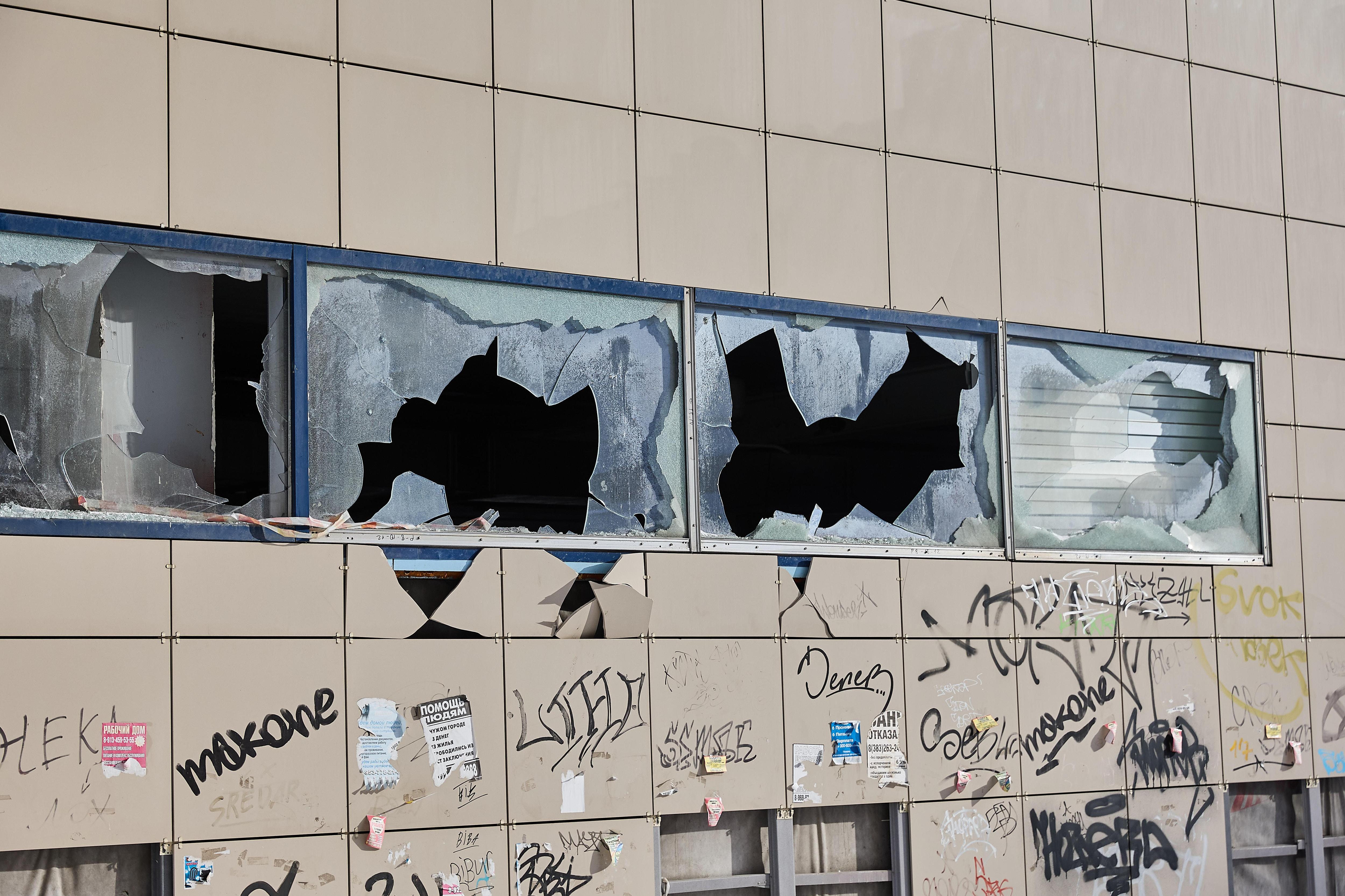 Внешний облик здания значительно повреждён: окна выбиты, а стены исписаны.