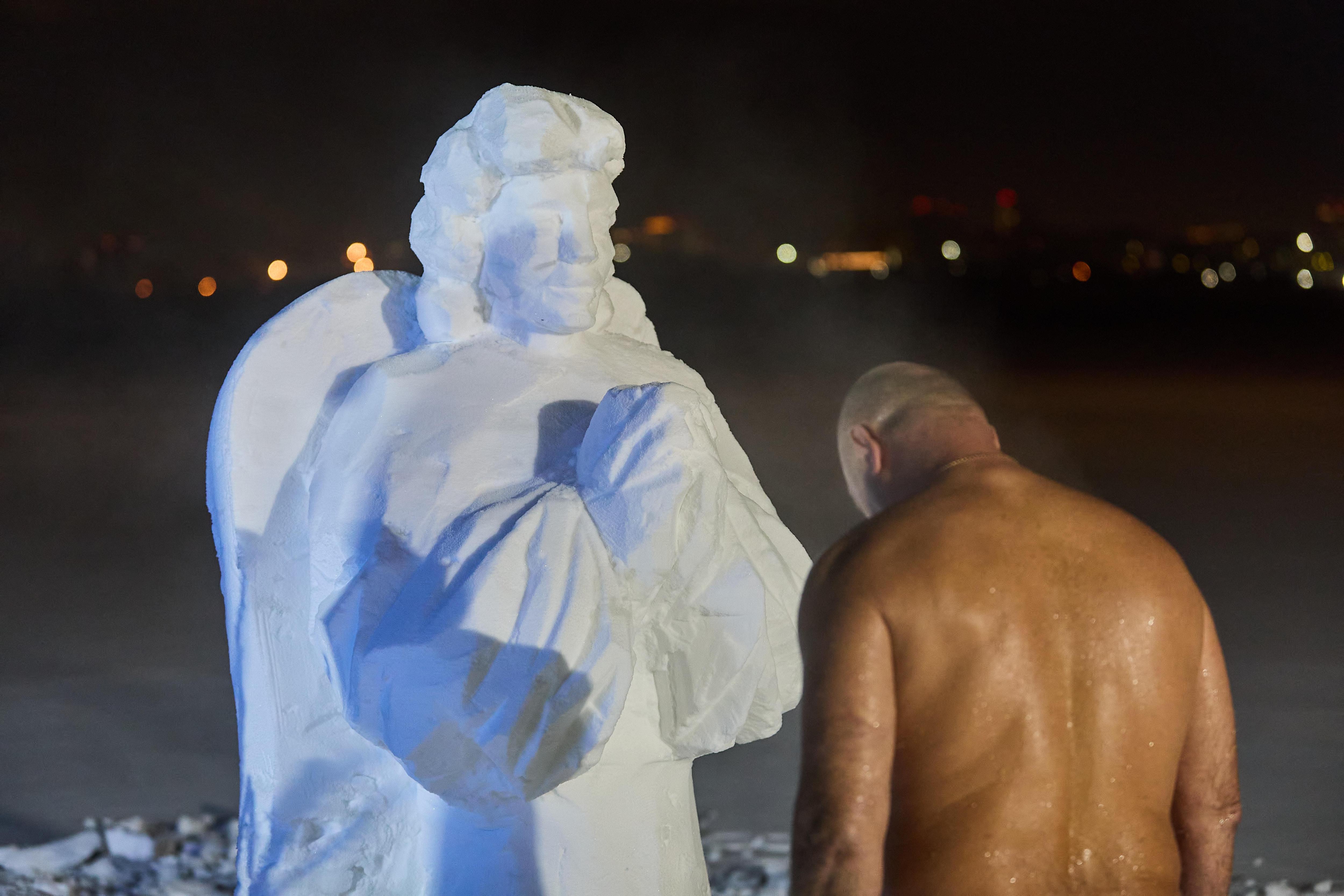 Возле купели в Затоне была установлена снежная скульптура ангела, вызвавшая интерес у горожан.