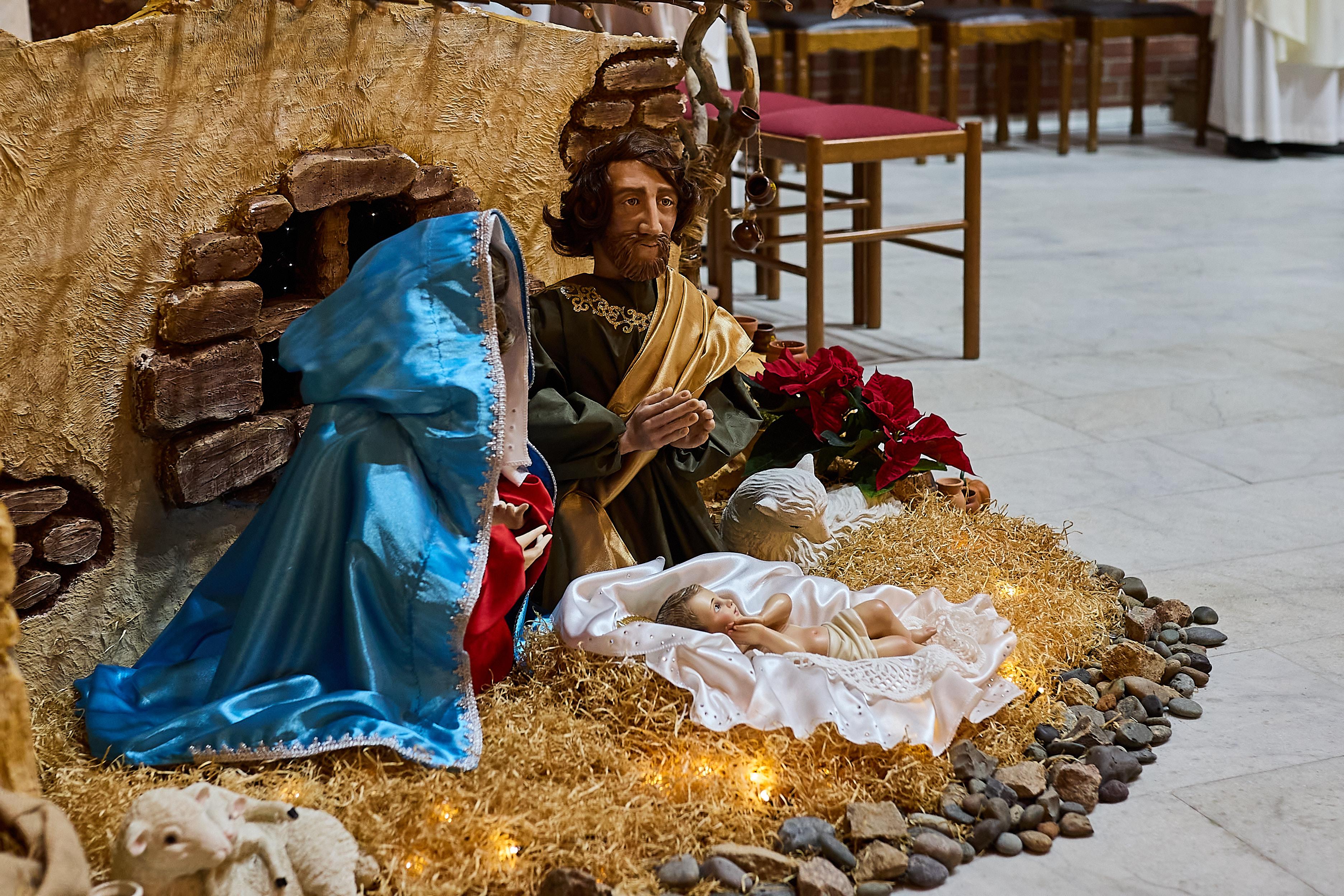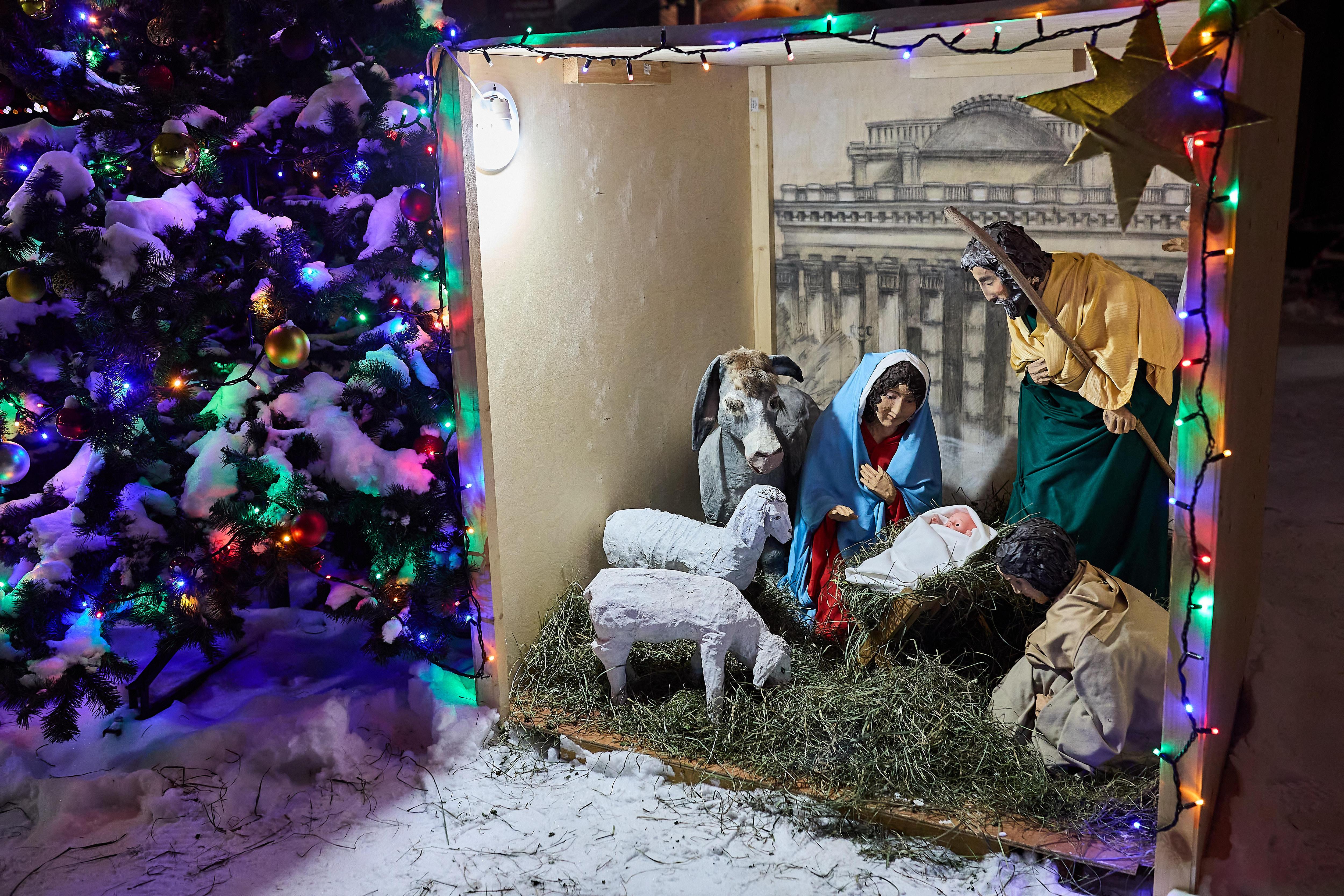 В соборе установили рождественский вертеп с фигуркой младенца.