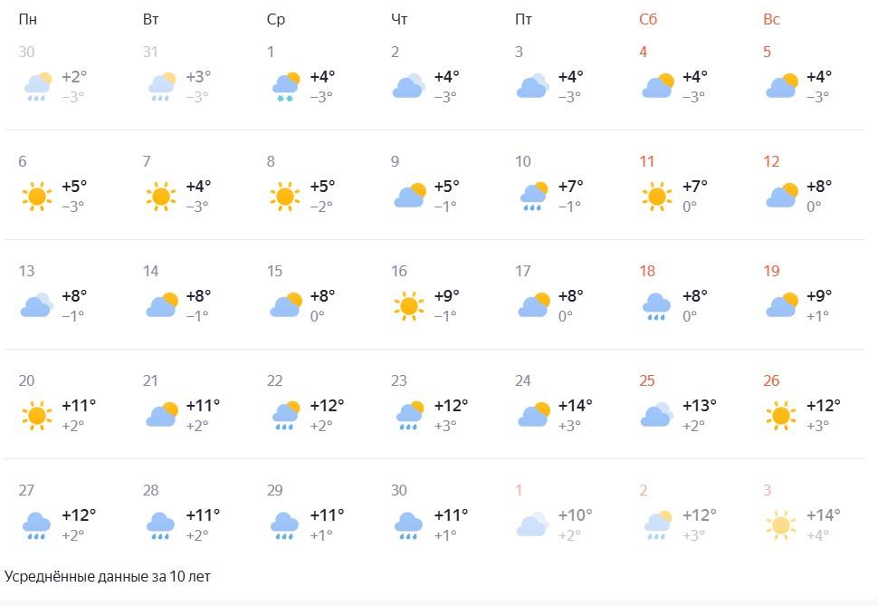 Согласно информации «Яндекс.Погоды», в течение месяца дневные температуры будут находиться в диапазоне от +4 до +12 градусов, а ночные — от -3 до +3. Первый дождь возможен уже 10 апреля.