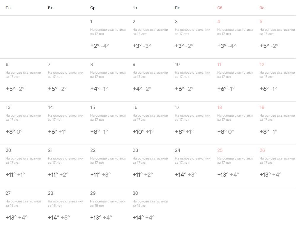 По данным «Погоды Mail.ru», в первую половину апреля днем будет +2…+6 градусов, ночью — -4…-1 градус. Во второй половине месяца в дневные часы воздух прогреется до +6…+14 градусов, а в ночные время температура установится в пределах от -1 до +5 градусов.