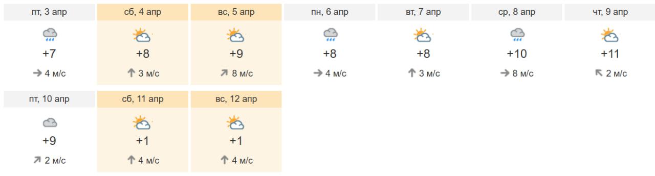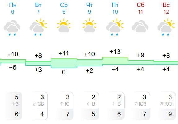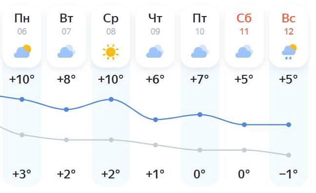 По данным «Яндекс Погоды», максимальные значения в +10 градусов ожидаются в понедельник и среду. Однако в субботу и воскресенье воздух прогреется лишь до +5 °C днем, а ночью температура упадет до -1 °C. В воскресенье также вероятен дождь.