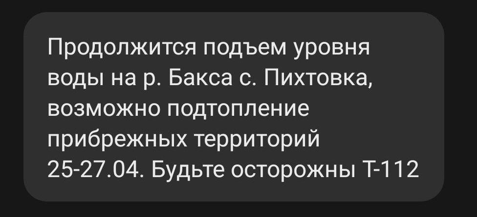 Жителям села Пихтовка в Колыванском районе поступило СМС-предупреждение от ГУ МЧС России по Новосибирской области о подъеме воды в реке Баксе. Согласно сообщению, уровень воды продолжит расти, что может привести к подтоплению прибрежных территорий 25–27 апреля.