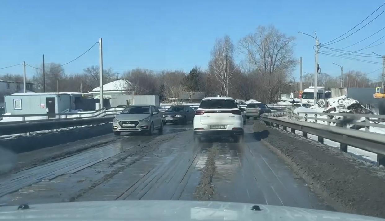 Состояние временного моста ухудшается из-за активного движения транспорта, включая тяжелые грузовики.