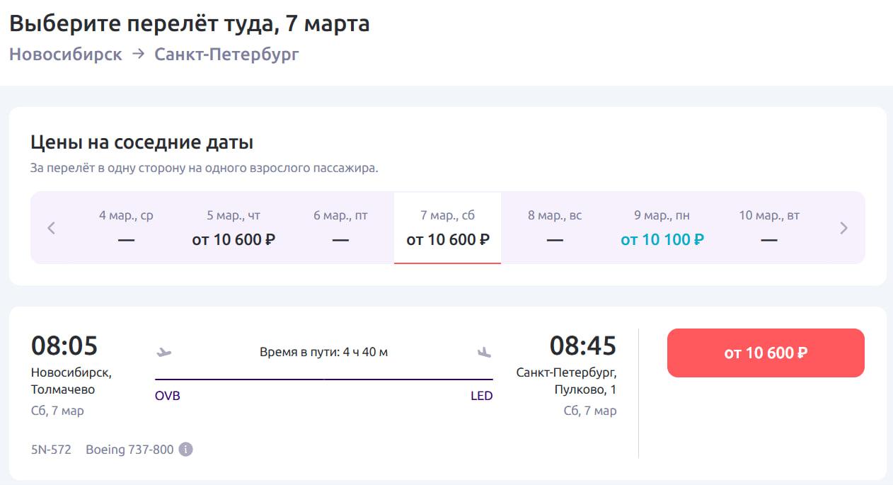 У авиакомпании Smartavia на 6 марта отсутствуют рейсы в Москву и Санкт-Петербург. Однако на 7 марта в столицу можно улететь от 6720 рублей, а в Санкт-Петербург на 5 или 7 марта — от 10 600 рублей.