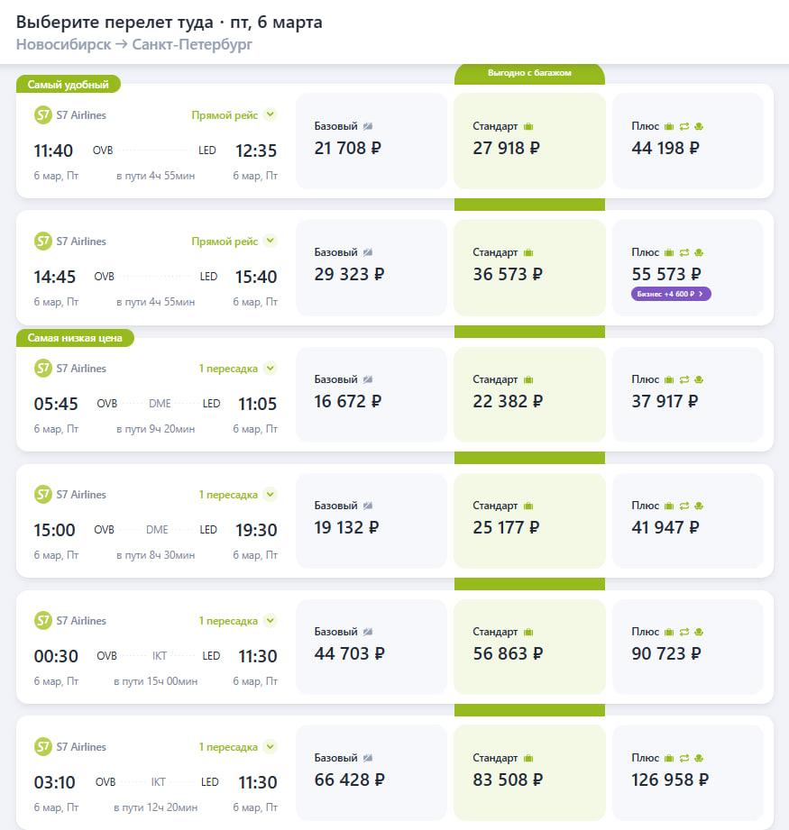 Тариф «Плюс» на перелет в Санкт-Петербург обойдется в 126 958 рублей.