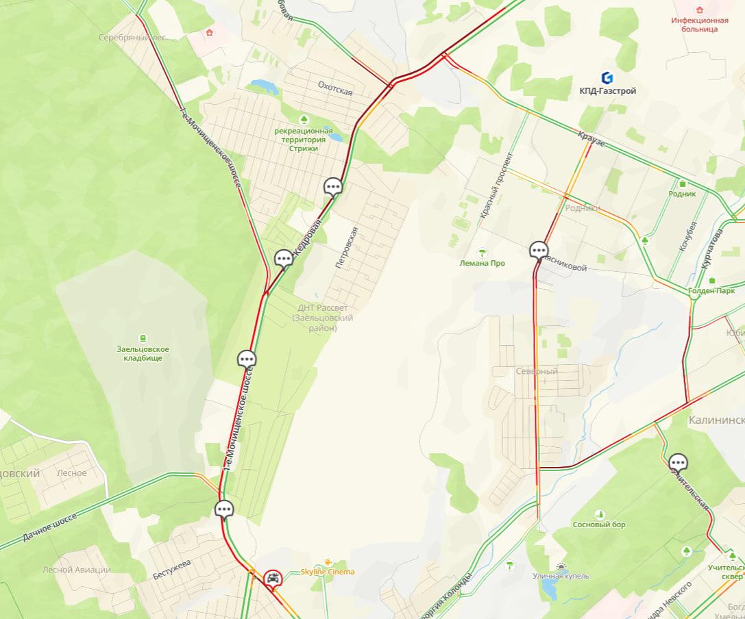Дорожный затор на Мочищенском шоссе растянулся на несколько километров.