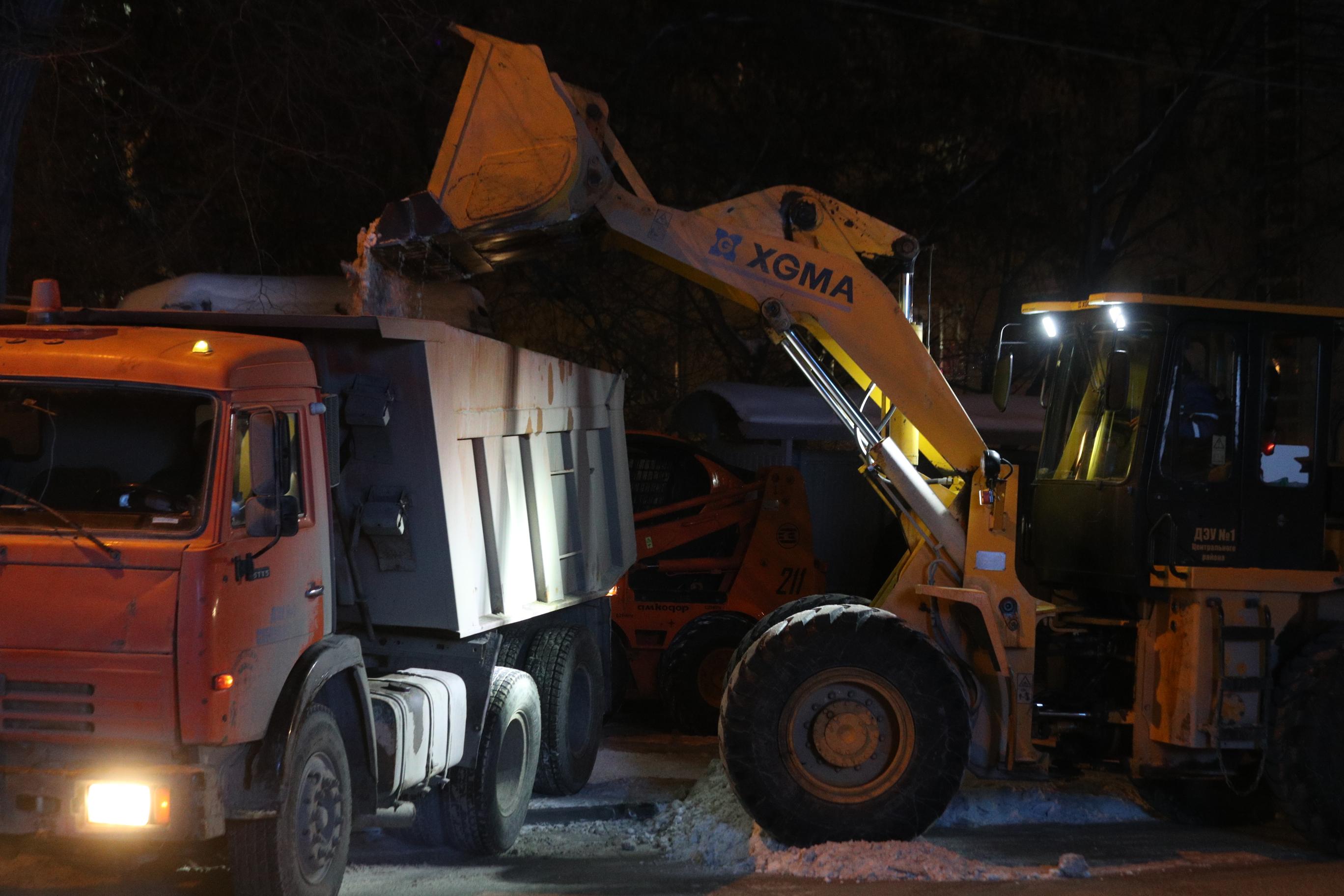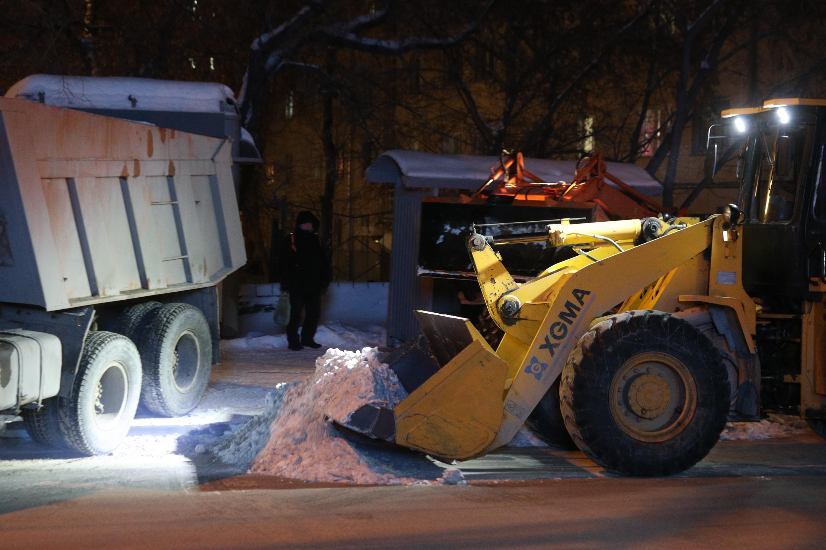 Фронтальные погрузчики занимались загрузкой снега для вывоза.