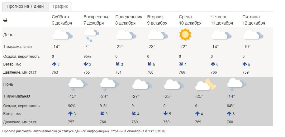 Данные Гидрометцентра указывают, что самая низкая ночная температура (-27°C) ожидается в период с 8 на 9 декабря. Потепление прогнозируется лишь к концу недели. Дневные значения в течение недели составят от -14 до -23 градусов.