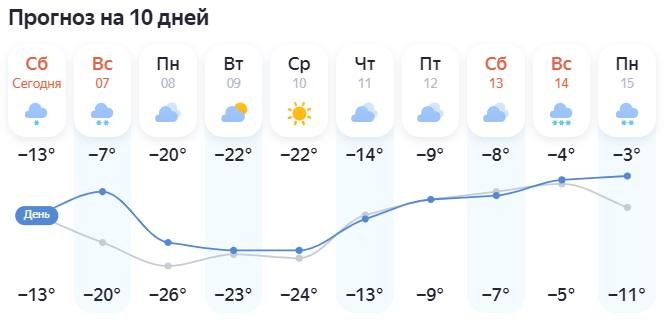 Прогноз «Яндекс Погоды» совпадает с официальным: сильные морозы с 8 по 10 декабря. Ночью ожидается -24…-26°, днем -20…-22°. Уже в четверг и пятницу температура поднимется до -9…-14 градусов.