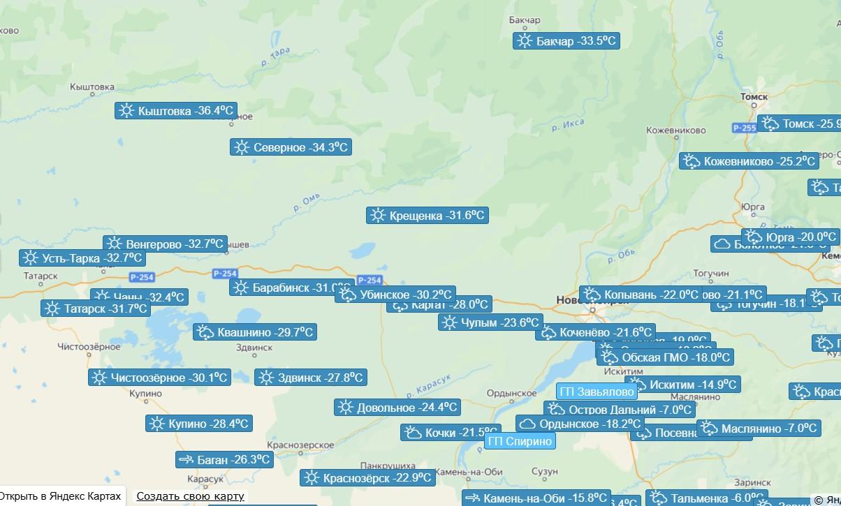 Согласно данным Западно-Сибирского УГМС, в Кыштовском районе сейчас -36,4°C, в Северном — -34,3°C. В Венгеровском районе, где ночью 21 декабря было зафиксировано -38°C, температура поднялась до -32,7°C, такой же показатель в Усть-Тарском районе. В Чановском районе -32,4°C, в Татарском — -31,7°C.