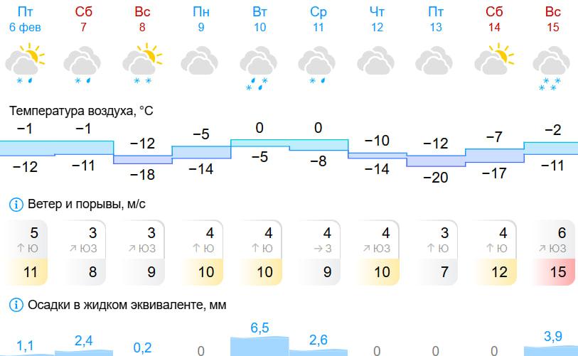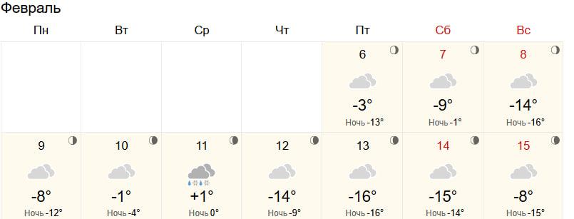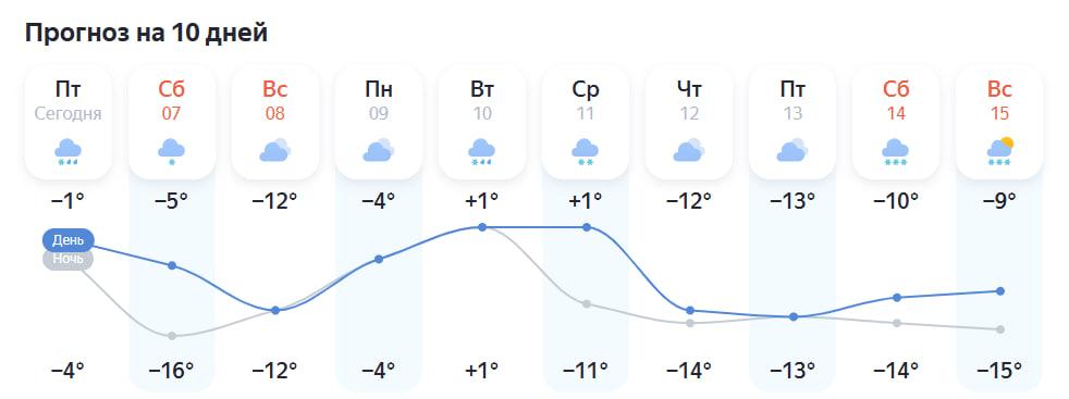 Прогноз «Яндекс Погоды» указывает на дневные температуры от +1 до -13 градусов и ночные от -4 до -14. Осадки в виде снега вероятны в среду, четверг, субботу и воскресенье. Самые тёплые дни — вторник и среда, самый холодный — пятница.