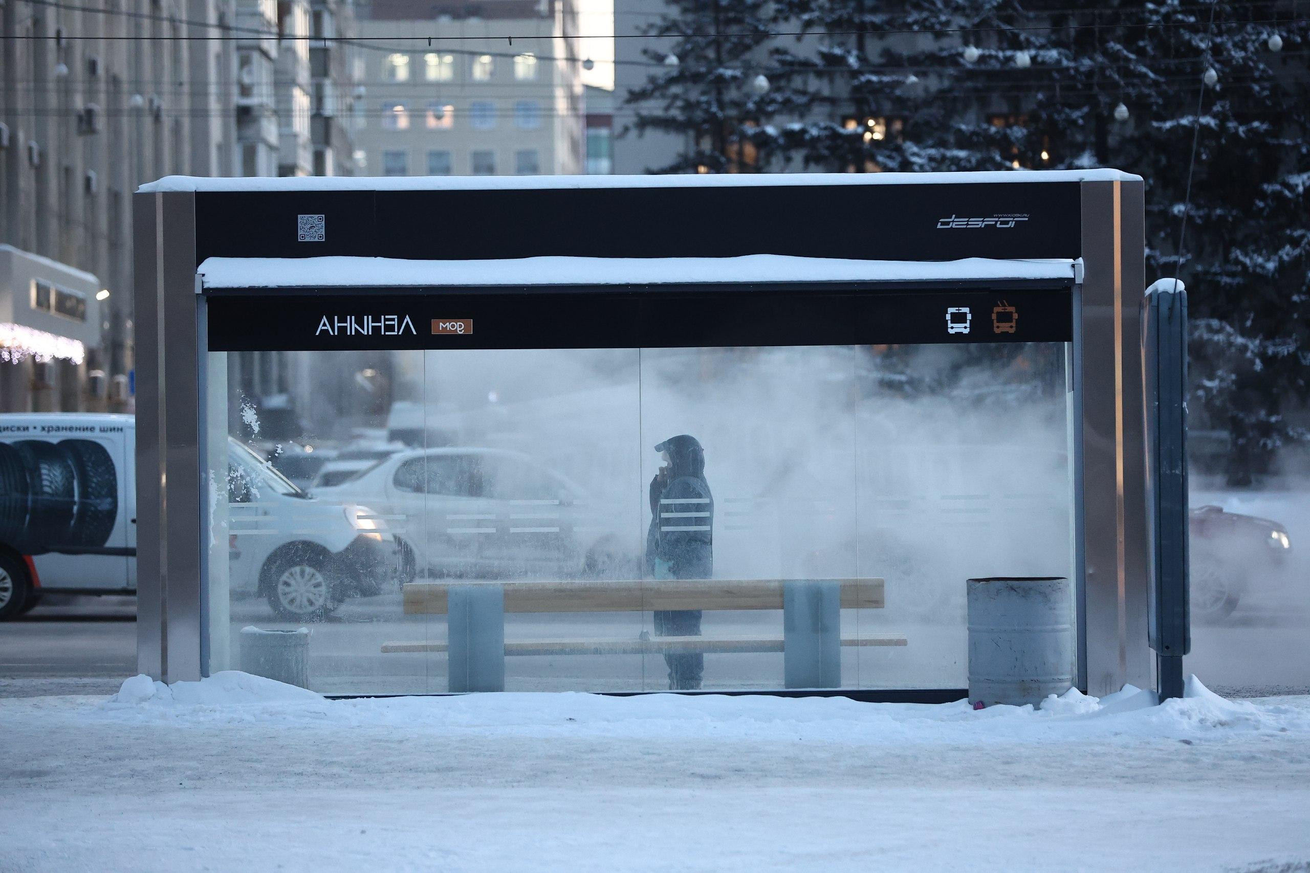 В такую погоду на остановках мало ожидающих, но некоторым приходится ждать общественный транспорт.