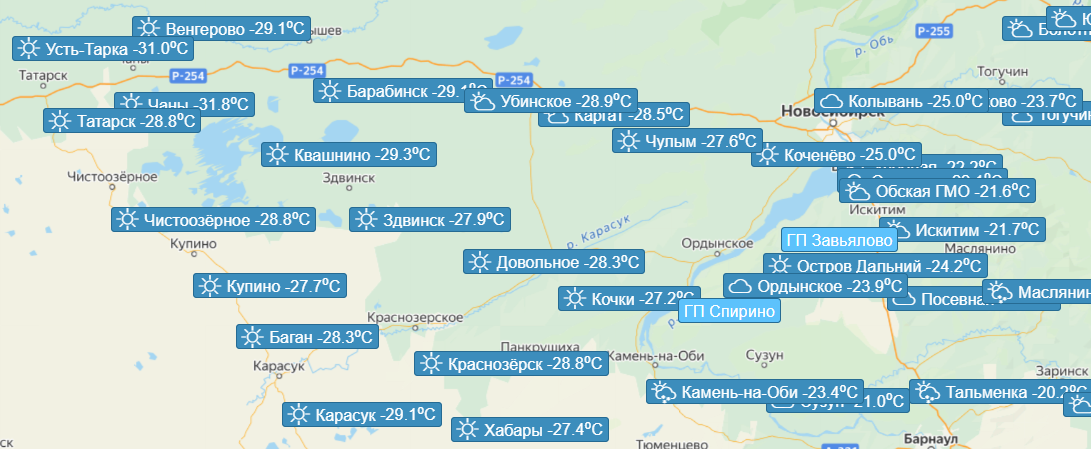 В ночь с 23 на 24 февраля в Новосибирской области ударили сильные морозы. Холоднее всего оказалось в поселке Чаны, где температура опустилась до -31,8°C, а в Усть-Тарке похолодало до -31°C.