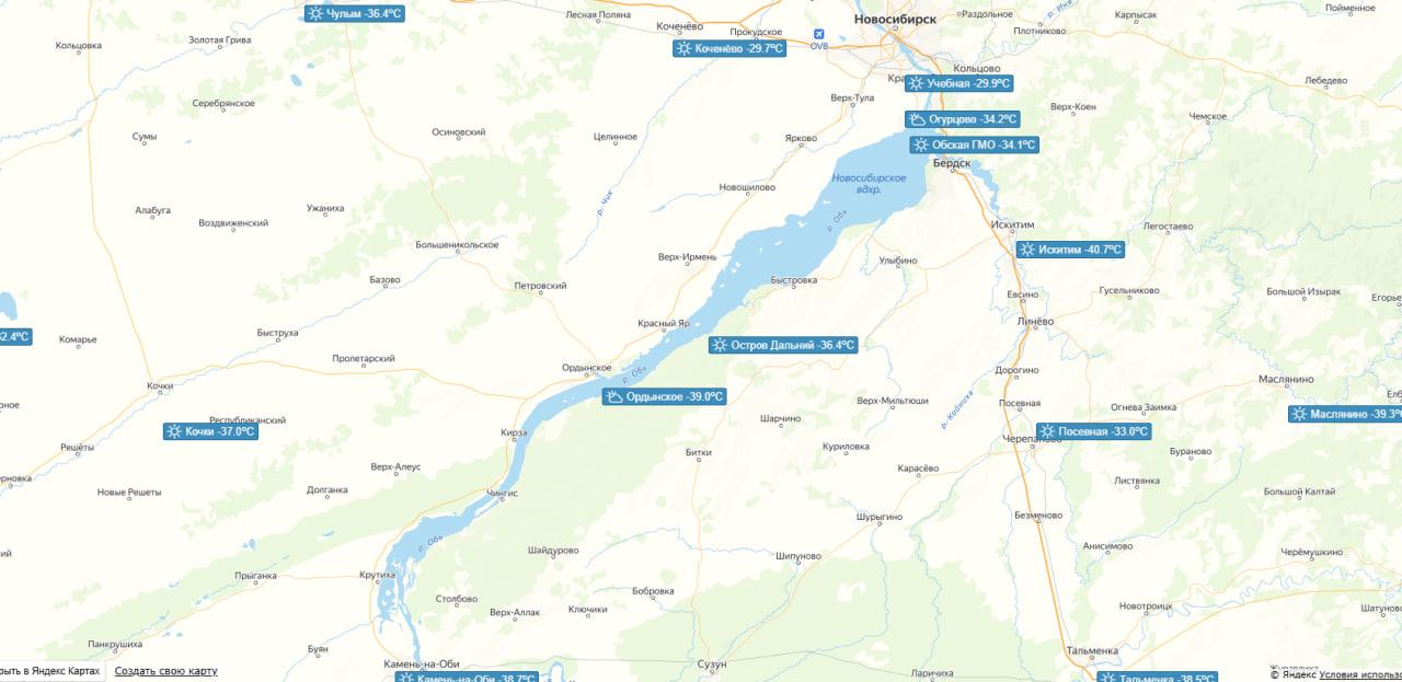 Самым холодным местом стал Искитим, где воздух остыл до -40,7°C. Почти такие же низкие температуры зарегистрировали в Маслянино (-39,3°C) и Тогучине (-35,3°C).